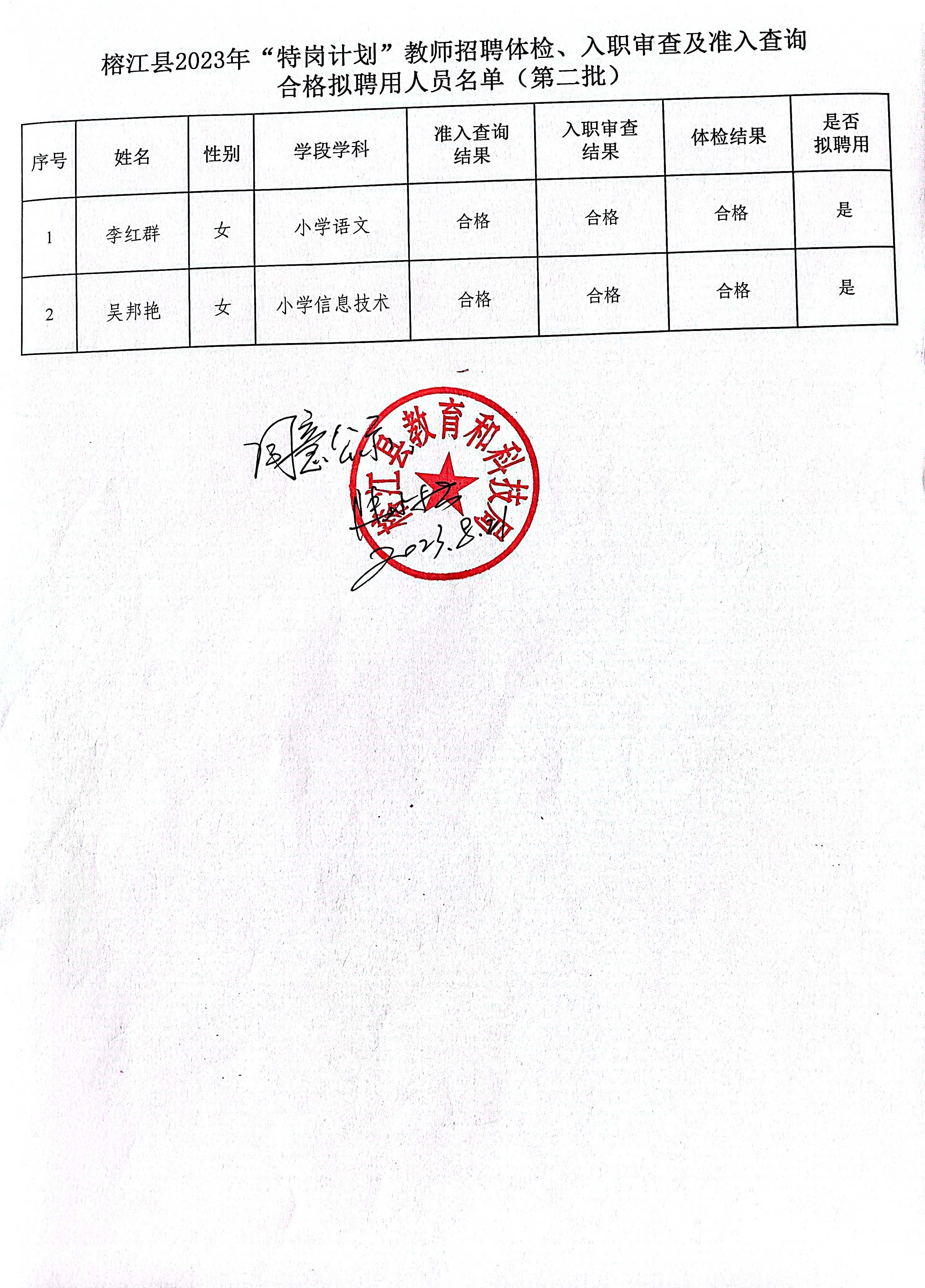 附件:榕江縣2023年“特崗計(jì)劃”教師招聘體檢、入職審查及準(zhǔn)入查詢合格擬聘用人員名單(第二批2人).xls